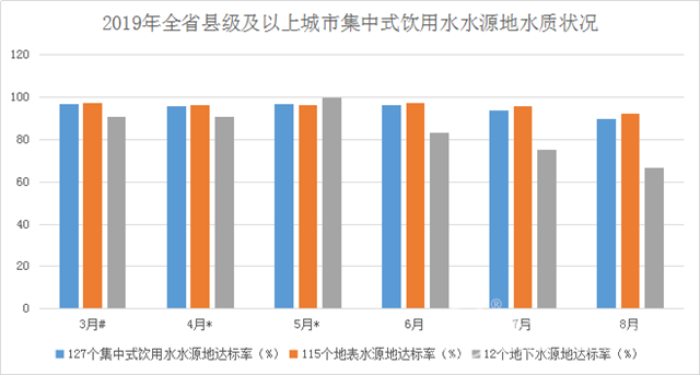 可以明顯看出,水質(zhì)波動(dòng)仍不能忽略,不過【集中式飲用水水源地達(dá)Ⅲ類比例】控制得較為穩(wěn)定。那就再來看下2019年全省縣級(jí)及以上城市集中式飲用水水源地水質(zhì)狀況: