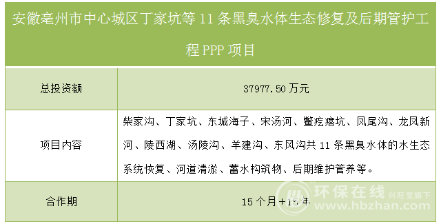安徽亳州市中心城區(qū)丁家坑等11條黑臭水體生態(tài)修復(fù)及后期管護(hù)工程PPP項(xiàng)目