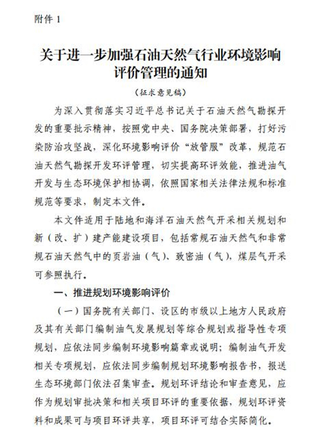 附件:1.《關(guān)于進(jìn)一步加強石油天然氣行業(yè)環(huán)境影響評價管理的通知(征求意見稿)》