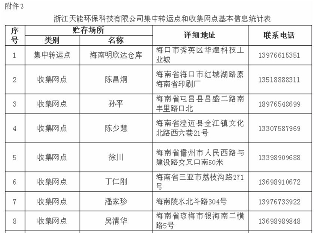 2. 浙江天能環(huán)??萍加邢薰炯修D(zhuǎn)運點和收集網(wǎng)點基本信息統(tǒng)計表