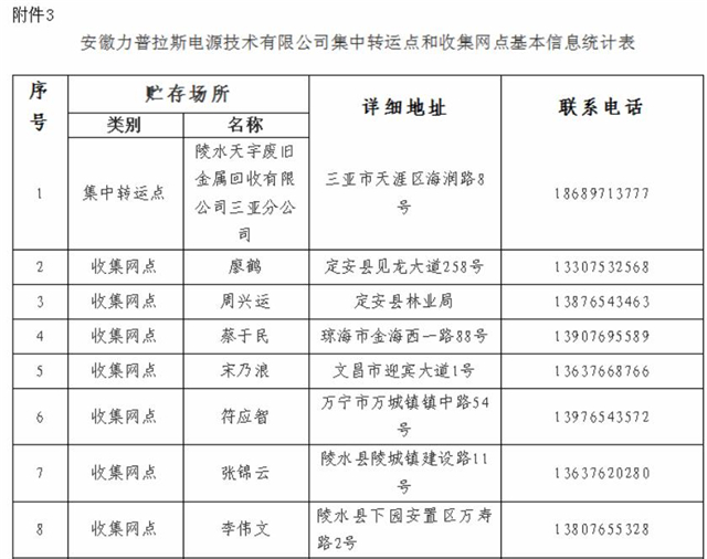 3.安徽力普拉斯電源技術有限公司集中轉(zhuǎn)運點和收集網(wǎng)點基本信息統(tǒng)計表
