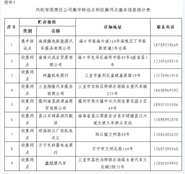依據(jù)《海南省鉛蓄電池生產(chǎn)企業(yè)集中收集和跨區(qū)域轉(zhuǎn)運制度試點工作方案》,經(jīng)審查和研究確定浙江南都電源動力股份有限公司、浙江天能環(huán)??萍加邢薰?、安徽力普拉斯電源技術有限公司、海南超能梯次再生資源有限公司、風帆有限責任公司等5家公司為廢鉛蓄電池試點單位。現(xiàn)將試點單位集中轉(zhuǎn)運點名稱與聯(lián)系方式、收集網(wǎng)點名稱與聯(lián)系方式等基本信息在門戶網(wǎng)站進行公布。