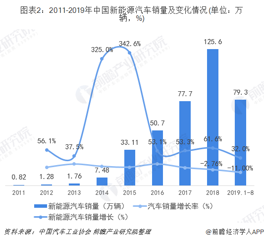 從需求端來看,根據(jù)汽車工業(yè)協(xié)會統(tǒng)計數(shù)據(jù),2018-2019年汽車整體需求疲軟,2018年,中國汽車銷量為2808.1萬輛,同比減少;2019年1-8月,汽車銷量1610.4萬輛,同比下降11%。但新能源汽車需求市場向好,2011-2019年新能源汽車市場銷量增速均遠高于汽車市場。