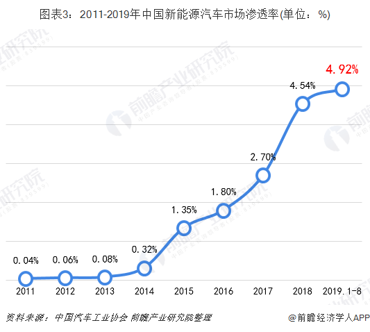 2014年全國進入新能源汽車產(chǎn)業(yè)高速增長年;2015年11月,我國新能源汽車產(chǎn)銷量在整體汽車行業(yè)里的占比首次突破1%關(guān)卡,我國也在這一年成為全球最大的新能源汽車市場。根據(jù)中國汽車工業(yè)協(xié)會最新公布的數(shù)據(jù)顯示,2011-2019年我國新能源汽車市場滲透率不斷攀升;2019年1-8月,我國新能源汽車市場滲透率增至4.92%。