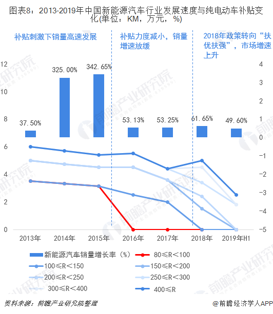 2018年,新能源汽車行業(yè)補貼力度整體再次縮減,但對于續(xù)電續(xù)駛里程大于300KM的補貼力度有所增強,新能源汽車銷量增速增長至60%以上。