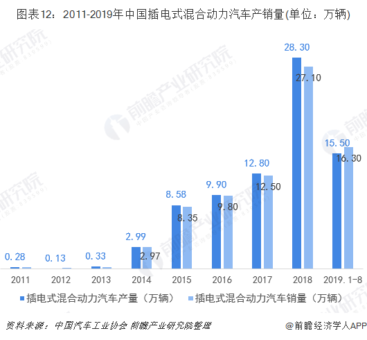 在我國新能源汽車市場上,插電式混合動力汽車一直受到純電動汽車的擠壓,主要受兩方面因素影響,第一,在政策補貼上,國家和地方對純電動汽車的補貼力度高于插電式混合動力汽車;第二,從地方路權(quán)來看,交通有關(guān)部分對純電動汽車給予的路權(quán)更寬。據(jù)中汽協(xié)數(shù)據(jù),2018年我國插電式混合動力汽車產(chǎn)銷分別完成28.3萬輛和27.10萬輛; 2019年1-8月,我國插電式混合動力汽車產(chǎn)銷分別完成15.5萬輛和16.3萬輛,比2018年同期分別增長1.6%和5.7%。
