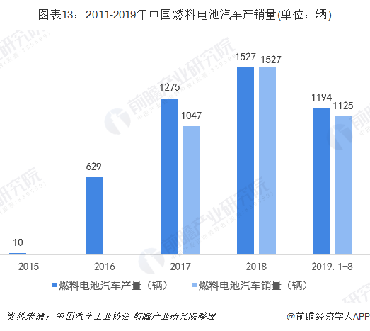 目前,混合動力汽車和純電動汽車已經(jīng)成功實現(xiàn)產(chǎn)業(yè)化,但燃料電池汽車仍受成本和技術(shù)的限制,產(chǎn)銷規(guī)模在新能源汽車中占比非常小。據(jù)中汽協(xié)的統(tǒng)計數(shù)據(jù)顯示,2018年國內(nèi)燃料電池汽車產(chǎn)銷量均為1527輛,且均為商用車。2019年被稱作我國燃料電池汽車商業(yè)化元年,2019年1-8月,我國燃料電池汽車產(chǎn)銷分別完成1194輛和1125輛,比2018年同期分別增長7.0倍和7.3倍。