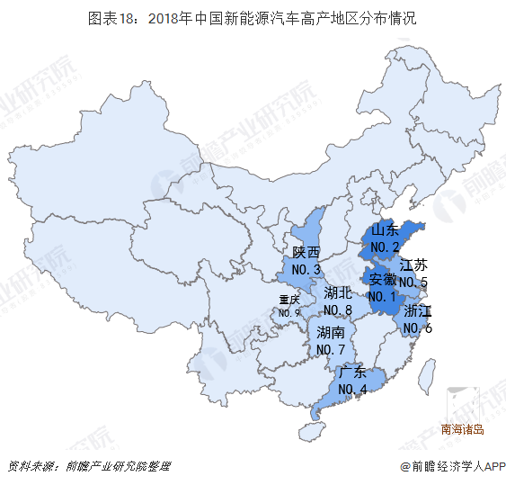 對比各地區(qū)有關(guān)部門發(fā)布的數(shù)據(jù)顯示,2018年TOP9地區(qū)的省份產(chǎn)量合計100.26萬噸,占全國總產(chǎn)量比重的78.94%。其中,安徽省新能源汽車產(chǎn)量排名全國第一,達15.8萬輛;山東省排名第二,約15萬輛;其次是陜西省和廣東省,新能源汽車產(chǎn)量超過13萬輛。
