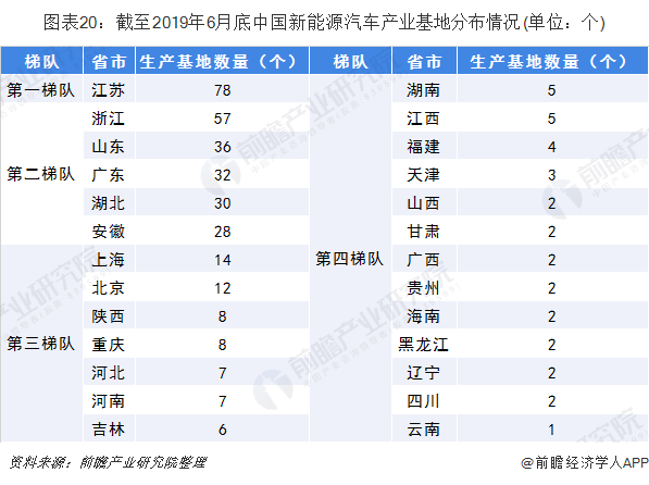 根據(jù)前瞻產(chǎn)業(yè)研究院對新能源汽車產(chǎn)業(yè)的長期監(jiān)測數(shù)據(jù),中國新能源汽車產(chǎn)業(yè)基地(包括規(guī)劃建設(shè)中)數(shù)量達357個。廣泛分布在26個省市,西藏、新疆、青海和內(nèi)蒙古暫未布局。其中,江蘇處于第一梯隊,生產(chǎn)基地數(shù)量高達78個;浙江、山東、廣東、湖北、安徽等處于第二梯隊,上海、北京、陜西、重慶、河北、河南和吉林處于第三梯隊,湖南、江西、福建等處于第四梯隊。