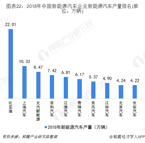 根據(jù)中國汽車工業(yè)協(xié)會數(shù)據(jù)顯示,2018年全國新能源汽車產(chǎn)量企業(yè)競爭格局中,比亞迪強勢領(lǐng)先;前三家車企分別為比亞迪(22.01萬輛)、上汽集團(10.33萬輛)和北汽新能源(8.47萬輛);全國新能源汽車產(chǎn)量前十家車企的產(chǎn)量達到80萬輛,占比高達60%以上。