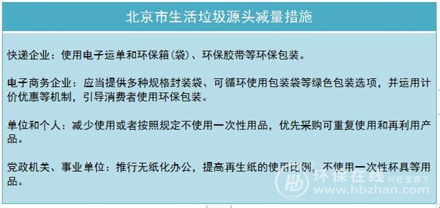 實(shí)踐證明,從垃圾產(chǎn)生的源頭抓起是關(guān)鍵,尤其是一些近年來(lái)發(fā)展火爆的行業(yè),比如快遞、餐飲、住宿和外賣等。因此,北京從個(gè)人、企事業(yè)機(jī)關(guān)單位、電子商務(wù)企業(yè)、快遞企業(yè)、餐飲服務(wù)業(yè)和住宿經(jīng)營(yíng)企業(yè)抓起,減少垃圾產(chǎn)生量,引導(dǎo)使用環(huán)保用品或材料。