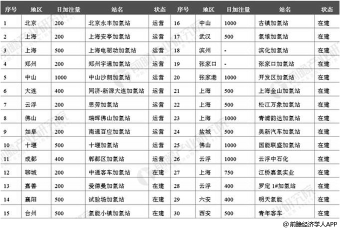截止至2019年中國正在運營與在建的部分加氫站分布情況