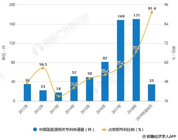 2011-2019年前8月中國氫能源相關(guān)專利申請量及占發(fā)明專利比例統(tǒng)計情況