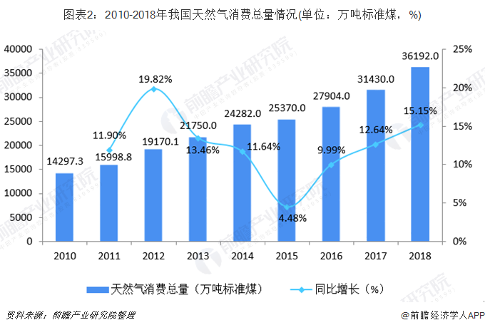 近年來,受中國的減煤增氣政策推動,天然氣成為中國近年來需求增長最快的能源產(chǎn)品。2010-2018年我國天然氣消費(fèi)量迅速上升,2018年全國天然氣消費(fèi)量達(dá)到36192萬噸標(biāo)準(zhǔn)煤,同比增長15.15%。預(yù)計到2050年國內(nèi)天然氣消費(fèi)需求將有望增長超過8000億方,屆時天然氣在一次能源消費(fèi)中的比重將提高至超過25%。