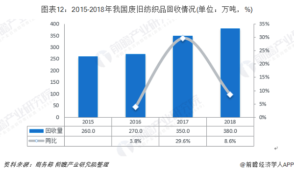 2018年,我國(guó)廢舊紡織品回收量約為380萬(wàn)噸,同比增長(zhǎng)8.6%。我國(guó)舊衣物回收渠道包括回收箱、線(xiàn)上回收、上門(mén)回收、銷(xiāo)售網(wǎng)點(diǎn)代收等,已覆蓋全國(guó)大中城市。舊衣物回收企業(yè)也多管齊下,采取多種回收渠道并舉的方式。