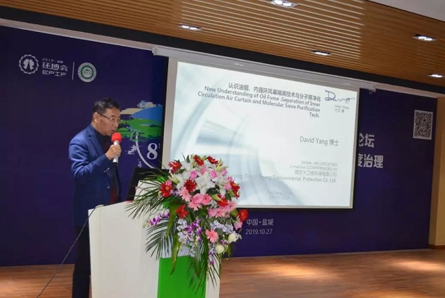 南京大衛(wèi)楊環(huán)保有限公司楊肇董事長介紹了內(nèi)風(fēng)幕循環(huán)隔離技術(shù)在油煙設(shè)備上的應(yīng)用。
