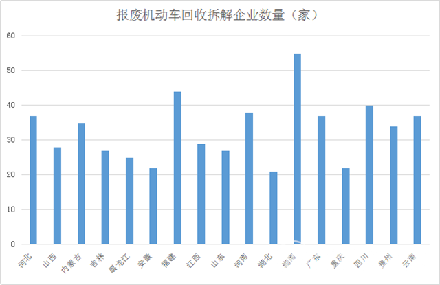 根據(jù)商務(wù)部公開的全國報(bào)廢機(jī)動(dòng)車回收拆解企業(yè)數(shù)據(jù)來看,一共是732家企業(yè)。來看一下,哪些省市的報(bào)廢機(jī)動(dòng)車回收拆解企業(yè)較多。