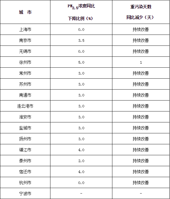 主要目標(biāo):穩(wěn)中求進(jìn),推進(jìn)環(huán)境空氣質(zhì)量持續(xù)改善,長(zhǎng)三角地區(qū)全面完成2019年環(huán)境空氣質(zhì)量改善目標(biāo),協(xié)同控制溫室氣體排放。秋冬季期間(2019年10月1日-2020年3月31日),PM2.5平均濃度同比下降2%,重度及以上污染天數(shù)同比減少2%(詳見(jiàn)附件1)。