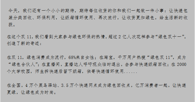 當(dāng)然,言歸正傳,環(huán)保對(duì)電商平臺(tái)和物流公司來說有多重要,就看馬云說的“未來的快遞業(yè),‘快’保證不輸,‘綠’才能贏”,為環(huán)保打Call的姿態(tài)可是正正的。