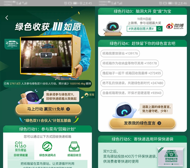 2019年雙十一,“回箱計(jì)劃”更是入駐購物平臺(tái),發(fā)起“綠色雙11合伙人”行動(dòng),以“贏雙11免單”的噱頭吸引更多人參與菜鳥“回箱計(jì)劃”。而為了更高的關(guān)注度,天貓雙十一發(fā)言人微博在11月12日發(fā)長圖“致每位收獲的你”。