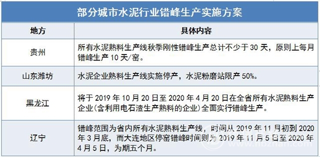 實踐是檢驗真理的好辦法。經(jīng)過近幾年來,對水泥行業(yè)實行脫硝改造,氮氧化物排放降低一半還多,為各地大氣質(zhì)量改善作出了不小的貢獻。今年秋冬,為了完成2019年大氣污染防治目標,為2020年藍天保衛(wèi)戰(zhàn)收官打下堅實基礎,很多地方紛紛重視起水泥行業(yè)的錯峰生產(chǎn),具體執(zhí)行情況如下表:
