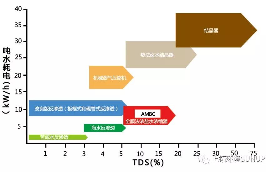 韓國項(xiàng)目主要采用海水淡化(SWRO)+高倍濃縮(AMBC),AMBC高倍濃縮技術(shù)是上拓環(huán)境利用對滲透和壓力驅(qū)動膜分離技術(shù)的理解與運(yùn)用開發(fā)的全膜法高效濃鹽水濃縮系統(tǒng)。該系統(tǒng)可以作為濃鹽水處理或零排放工藝的一部分,消除或減少蒸發(fā)設(shè)備的體積,操作過程和傳統(tǒng)的海水反滲透類似,但是可以生產(chǎn)超過210,000mg/l氯化鈉濃度滲透壓的濃鹽水。