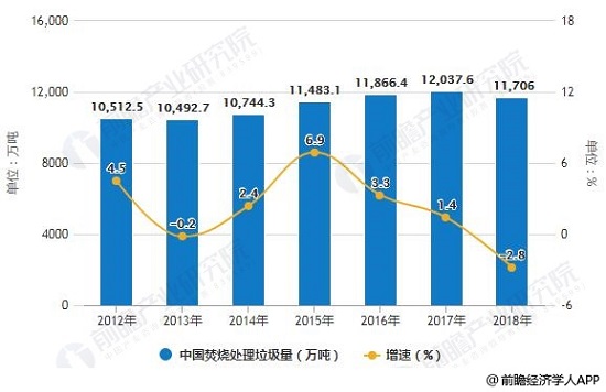 2012-2018年中國焚燒處理垃圾量統(tǒng)計及增長情況
