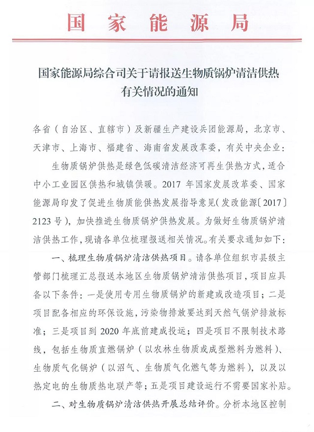 近日,國(guó)家能源局下發(fā)《國(guó)家能源局綜合司關(guān)于請(qǐng)報(bào)送生物質(zhì)鍋爐清潔供熱有關(guān)情況的通知》(以下簡(jiǎn)稱《通知》),要求各地方能源局、發(fā)改委、有關(guān)中央企業(yè)報(bào)送生物質(zhì)鍋爐清潔供熱相關(guān)情況。