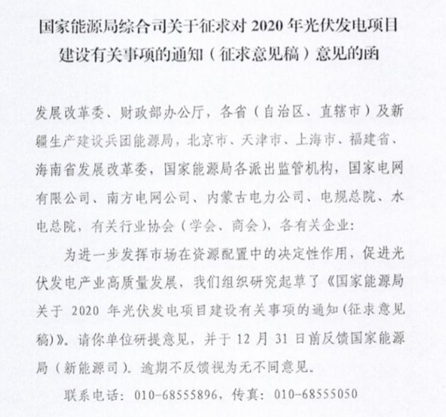 2019年12月16日,國家能源局印發(fā)《關(guān)于征求對2020年光伏發(fā)電項(xiàng)目建設(shè)有關(guān)事項(xiàng)的通知(征求意見稿)意見的函》(簡稱“通知”),其中包括五大主要內(nèi)容,明確2020年競價(jià)項(xiàng)目配置工作總體思路、項(xiàng)目管理、競爭配置方法仍按2019年工作方案執(zhí)行。
