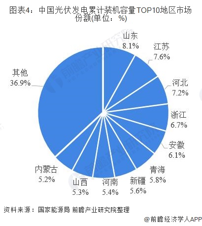 累計裝機(jī)容量方面,截至2019年第三季度,我國共有9個地區(qū)光伏發(fā)電累計裝機(jī)容量超過1000萬千瓦。其中山東以1541萬千瓦,排名第一,占全國總裝機(jī)容量的8.1%;江蘇和河北緊隨其后,分別以1445萬千瓦和1363瓦千瓦占全國總裝機(jī)容量的73.6%及7.2%。