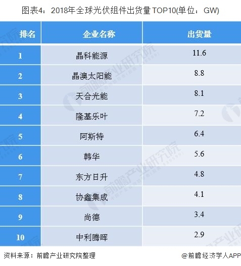 根據(jù)Global Data發(fā)布的數(shù)據(jù),2018年全球組件出貨量排名前10的公司中,9家來自中國。其中,晶科以11.6GW的出貨量和12.8%的市場份額繼續(xù)保持全球組件出貨第一的位置。晶科之所以能夠保持榜首的位置,得益于其向海外市場擴(kuò)張的決心,而不是在中國政府削減對光伏行業(yè)的激勵措施之際繼續(xù)致力于中國本土市場。同時,晶澳正在以其雙面組件技術(shù)向中東市場擴(kuò)張,并在產(chǎn)品質(zhì)量、可靠性、性能和創(chuàng)新方面處于強(qiáng)勢地位,2018年晶澳以8.8GW的出貨量排名全球第二。排名第三的是天合光能,出貨量為8.1GW。