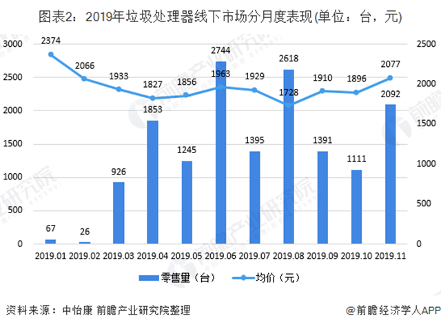 根據(jù)中怡康數(shù)據(jù),2019年1-11月,在線下市場(chǎng)中垃圾處理器零售量達(dá)到15468臺(tái)。其中2019年6月份銷(xiāo)售量最高,垃圾處理器零售量達(dá)到2744臺(tái),均價(jià)為1963元。