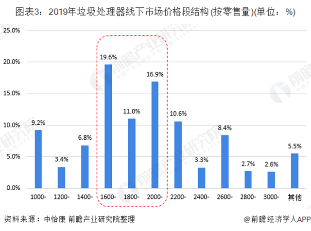 根據(jù)中怡康數(shù)據(jù),2019年垃圾處理器價(jià)格主要集中在1500-2000價(jià)位段,其零售量占比達(dá)到總零售量的47.5%。其中1600-1800價(jià)格段零售量占比達(dá)到19.6%,在所有價(jià)格段里占比最高。