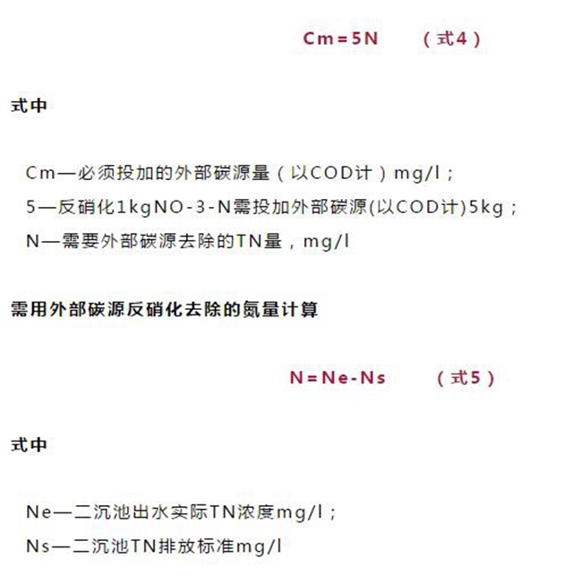 在硝化反硝化系統(tǒng)中,因內(nèi)回流攜帶DO的影響,實(shí)際中投加碳源的量并和理論值相差很大,運(yùn)營中往往是按照經(jīng)驗公式來計算的,簡單方便快捷,脫氮系統(tǒng)的CN比的經(jīng)驗值一般控制在4~6,很多時間會采用中間值計算或者通過對化驗出水TN來調(diào)整投加量!