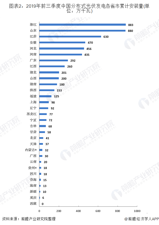 從區(qū)域格局來(lái)看,截至2019年9月底,全國(guó)光伏發(fā)電累計(jì)裝機(jī)19019萬(wàn)千瓦,同比增長(zhǎng)15%,新增1599萬(wàn)千瓦。其中分布式光伏發(fā)電裝機(jī)5870萬(wàn)千瓦,同比增長(zhǎng)28%,新增826萬(wàn)千瓦。其中浙江、山東、江蘇的累計(jì)裝機(jī)量在全國(guó)占前三位。
