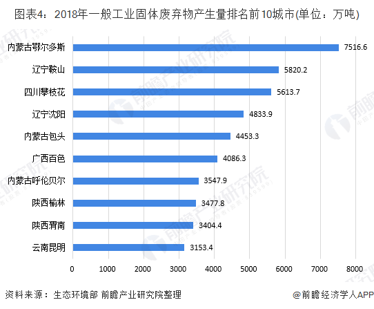 根據(jù)生態(tài)環(huán)境部統(tǒng)計數(shù)據(jù),2018年200個大、中城市中,一般工業(yè)固體廢物產(chǎn)生量排名前10位的城市產(chǎn)生的一般工業(yè)固體廢物總量為4.6億噸,占全部信息發(fā)布城市產(chǎn)生總量的29.7%。其中內(nèi)蒙古自治區(qū)鄂爾多斯市產(chǎn)生量居首,達到7516.6萬噸。