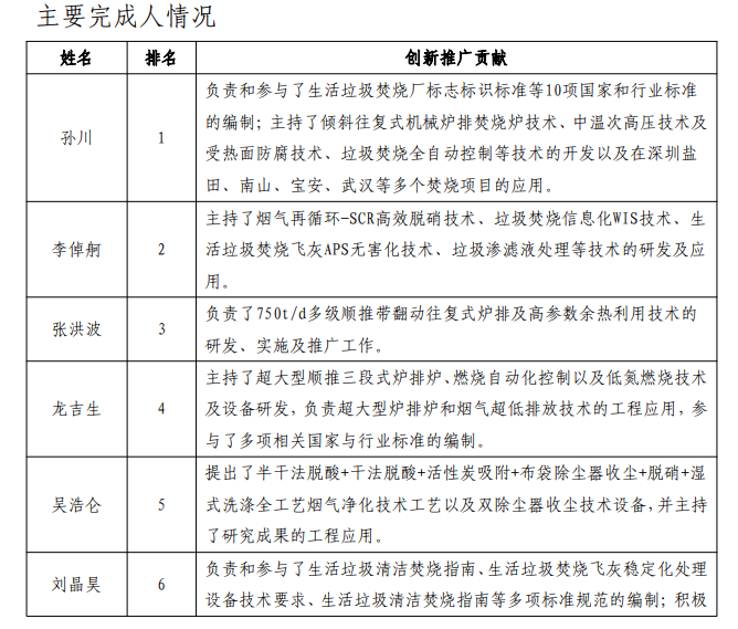 主要完成單位:深圳市能源環(huán)保有限公司、光大環(huán)保(中國(guó)) 有限公司、上??岛悱h(huán)境股份有限公司、中國(guó)城市建設(shè)研究 院有限公司、中國(guó)城市環(huán)境衛(wèi)生協(xié)會(huì)、無(wú)錫市華星東方電力 環(huán)??萍加邢薰?、綠色動(dòng)力環(huán)保集團(tuán)股份有限公司