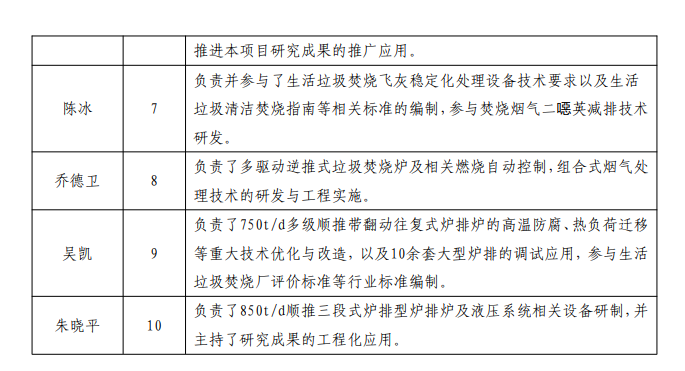 完成人合作關(guān)系說(shuō)明:多年來(lái),深圳市能源環(huán)保有限公司、 光大環(huán)保(中國(guó))有限公司、上??岛悱h(huán)境股份有限公司、 中國(guó)城市建設(shè)研究院有限公司、中國(guó)城市環(huán)境衛(wèi)生協(xié)會(huì)、無(wú) 錫市華星東方電力環(huán)保科技有限公司、綠色動(dòng)力環(huán)保集團(tuán)股 份有限公司,圍繞生活垃圾清潔焚燒所需要的能源利用效率 提升、污染物排放總量削減、自動(dòng)化控制水平提高等方面的 關(guān)鍵技術(shù),依托國(guó)家科技支撐計(jì)劃、住建部等項(xiàng)目開(kāi)展持續(xù) 的合作研究,合作形成多項(xiàng)包括發(fā)明專(zhuān)利、專(zhuān)著、標(biāo)準(zhǔn)和獲 獎(jiǎng)等在內(nèi)的知識(shí)產(chǎn)權(quán)和成果。合作完成多個(gè)科研項(xiàng)目、軟件、 論文等。