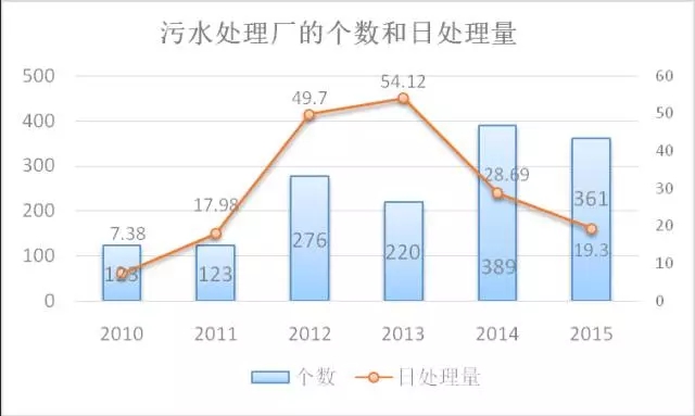 2010-2015進(jìn)行生活污水處理的行政村統(tǒng)計圖