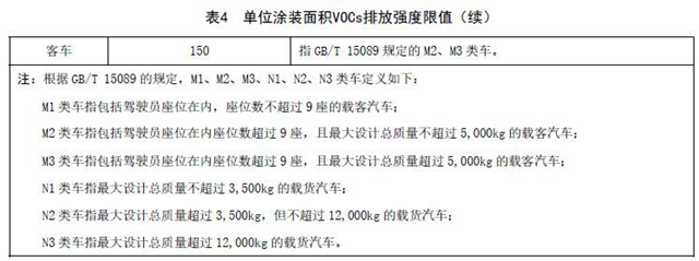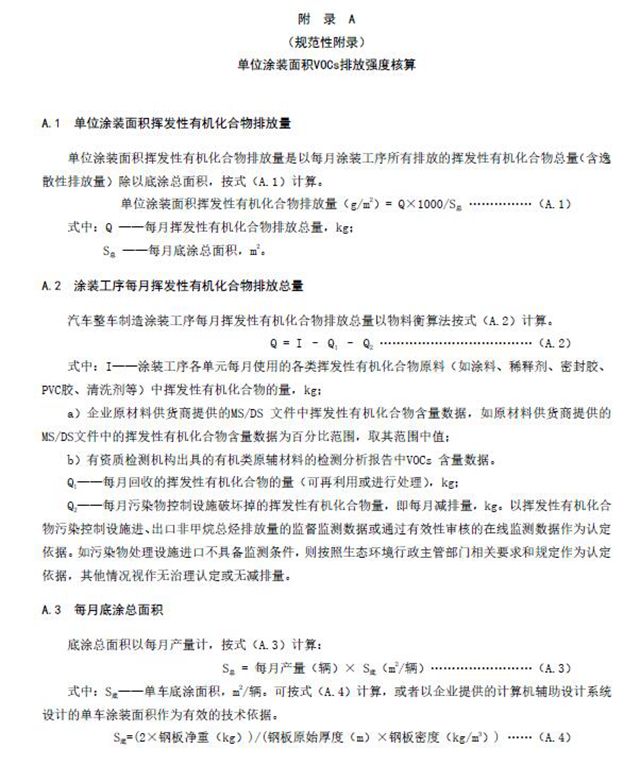 單位涂裝面積VOCs排放強度限值應(yīng)符合表4規(guī)定,計算方法按附錄A執(zhí)行,國家發(fā)布行業(yè)污染源源強核算標準后,依據(jù)國家源強核算標準進行核算。