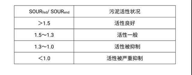 可依據(jù)SOURfed和SOURend的比值判斷污泥活性是否抑制,具體見下表。