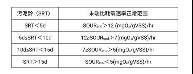 從曝氣池不同位置取樣,測定的SOUR也不一樣。從曝氣池好氧段首端取樣測得的用SOURfed表示,從曝氣池末端取樣測得的用SOURend表示,SOURfed通常高于SOURend。SOUR受很多具體因素影響,各污水處理廠應(yīng)以自行比較為主,當(dāng)SOUR比以往數(shù)據(jù)降低,說明活性污泥受到某些因素影響導(dǎo)致活性降低。當(dāng)缺乏本廠歷史數(shù)據(jù)時,可用依據(jù)下表判斷污泥活性是否正常,當(dāng)實測SOURend低于對應(yīng)的參考值,說明污泥活性由于某種因素被抑制: