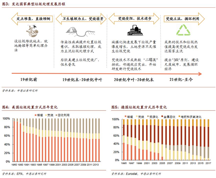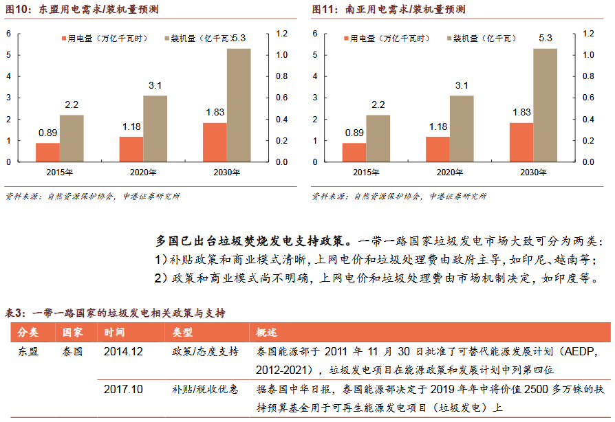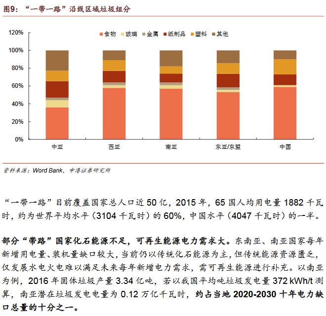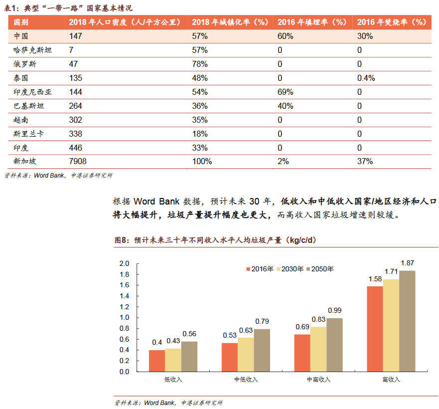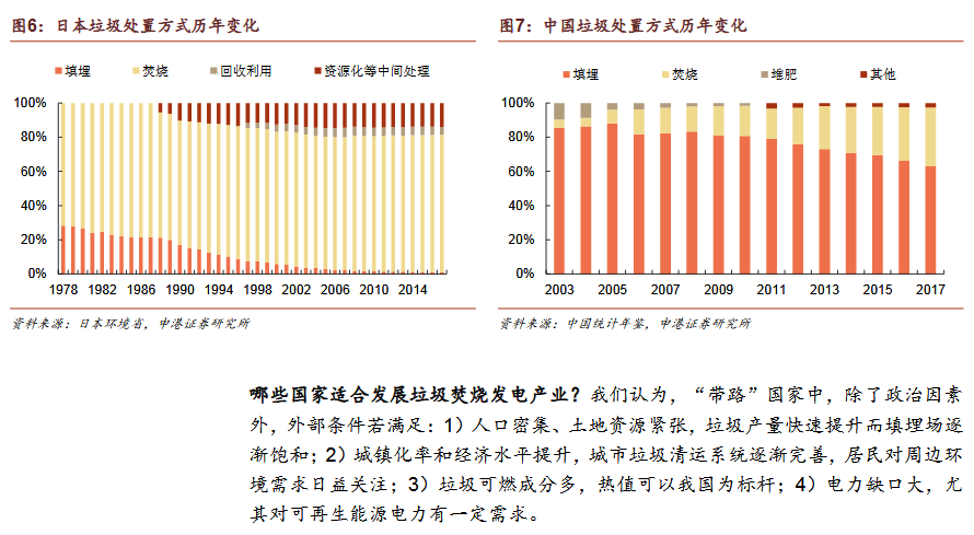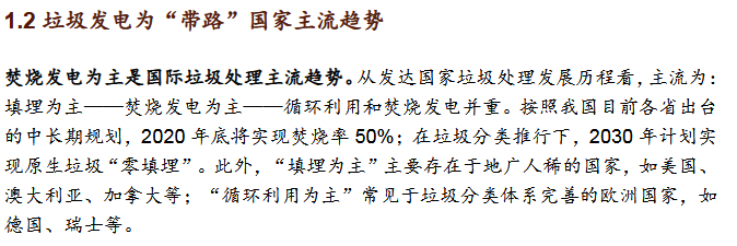 2)垃圾發(fā)電為“帶路”國家主流發(fā)展趨勢焚燒發(fā)電為主是國際垃圾處理主流趨勢。發(fā)達(dá)國家垃圾處理的流程為:填埋為主——焚燒發(fā)電為主——循環(huán)利用和焚燒發(fā)電并重。我國計劃2020年底實現(xiàn)焚燒率50%,2030年實現(xiàn)原生垃圾“零填埋”?!皫贰眹曳侠贌龡l件。