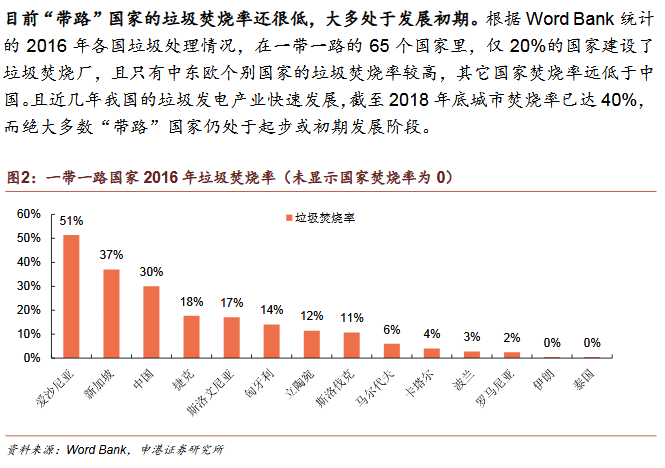 1)“帶路”國家垃圾發(fā)電正處起步階段近年來國內(nèi)垃圾發(fā)電市場快速發(fā)展,東南沿海布局日趨完善,在“一帶一路”政策下我國企業(yè)紛紛放眼海外垃圾發(fā)電市場,未來幾年海外市場將成為國內(nèi)龍頭新的角逐地。目前“帶路”國家的垃圾焚燒率很低,16年沿線65國僅有20%建設(shè)了焚燒廠,絕大多數(shù)還處于發(fā)展初期。
