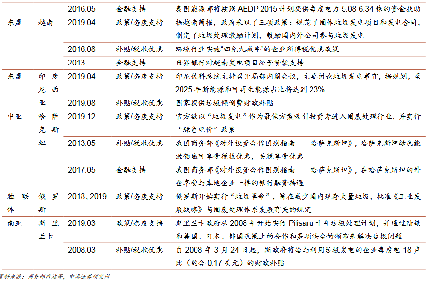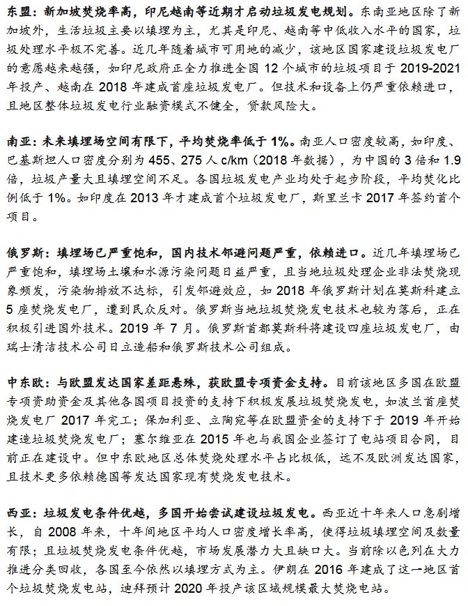 a)人口密集、土地資源緊張,垃圾產(chǎn)量快速提升而填埋場逐漸飽和;b)城鎮(zhèn)化率和經(jīng)濟(jì)水平提升,城市垃圾清運系統(tǒng)逐漸完善,居民對周邊環(huán)境需求日益關(guān)注;c)熱值與我國接近,能適應(yīng)我國焚燒爐;d)電力缺口大,部分地區(qū)資源緊張,對可再生能源電力有一定需求。多國已出臺垃圾焚燒發(fā)電支持政策。印尼、越南等國已出臺補(bǔ)貼政策,商業(yè)模式清晰,上網(wǎng)電價和垃圾處理費由政府主導(dǎo);部分國家政策和商業(yè)模式尚不明確,上網(wǎng)電價和垃圾處理費由市場機(jī)制決定,如印度。