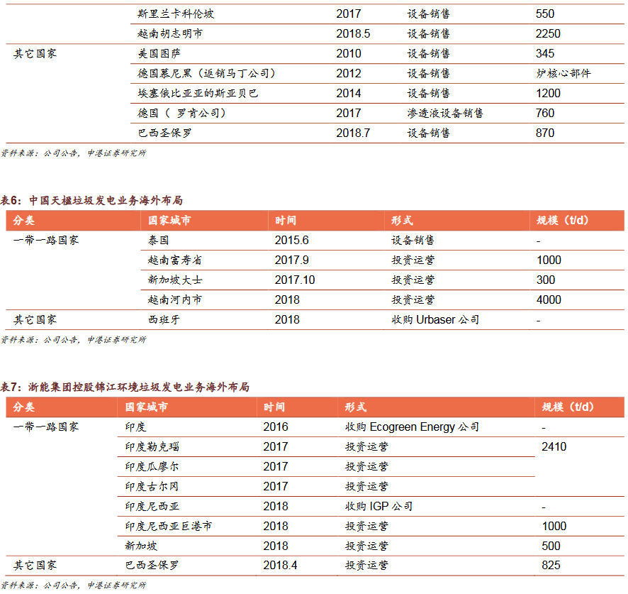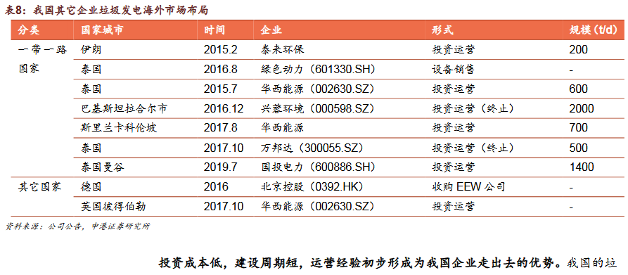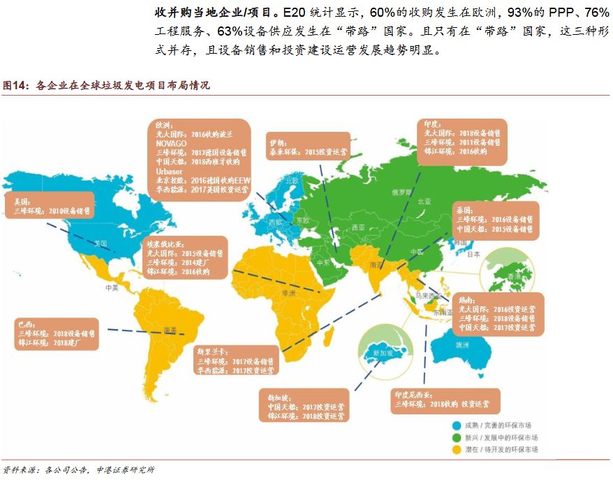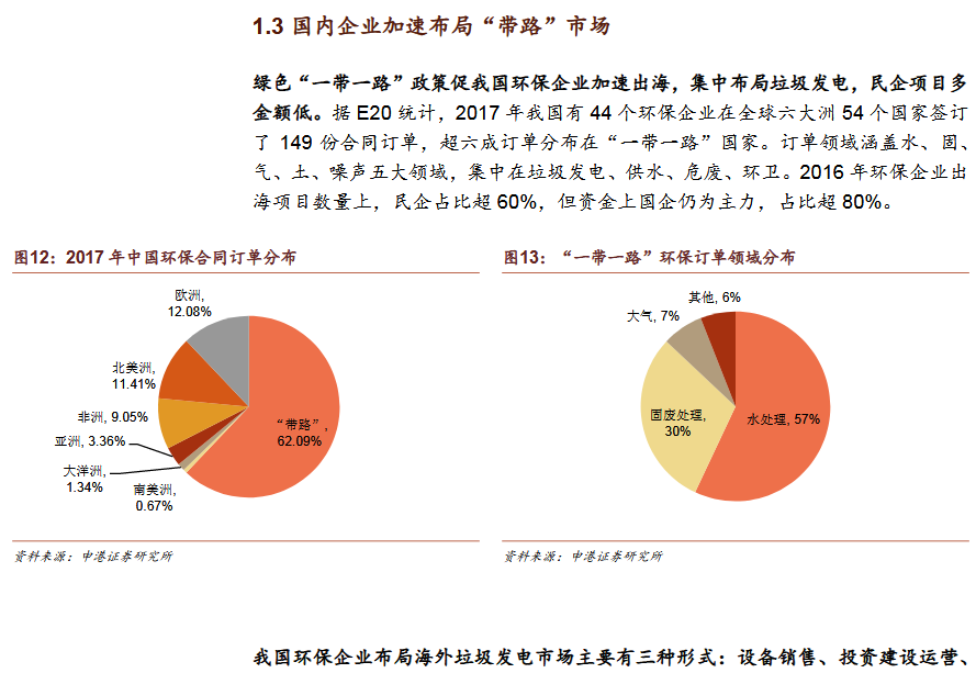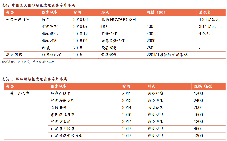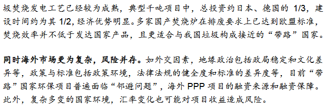 3)國內(nèi)企業(yè)加速布局“帶路”市場綠色“一帶一路”政策促我國環(huán)保企業(yè)加速出海,集中布局垃圾發(fā)電,民企項目多金額低。我國海外垃圾發(fā)電業(yè)務(wù)模式為:設(shè)備銷售、投資建設(shè)運營、收并購當(dāng)?shù)仄髽I(yè)/項目。我國企業(yè)以投資成本低,建設(shè)周期短,運營經(jīng)驗初步形成為優(yōu)勢,但同時也面臨了海外市場的復(fù)雜性和風(fēng)險。