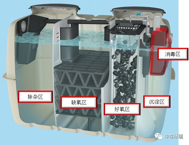 中國中車的農(nóng)村污水處理成套裝備已集成了消毒藥劑的儲存、投加與混合功能,操作方便,可迅速投入使用。例如,圖1-2為中國中車某型凈化槽及其消毒功能的使用方法。其采用緩釋氯片作為消毒劑,使用時將氯片放入藥劑筒,通過旋轉(zhuǎn)調(diào)節(jié)藥劑筒底部的開口即可調(diào)節(jié)消毒劑的溶解量。