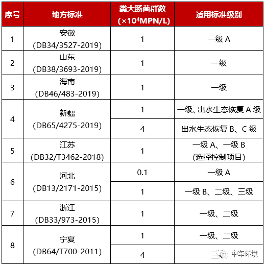 農(nóng)村污水處理設(shè)施尾水一般就近進(jìn)入村莊周邊河道坑塘,或用于農(nóng)田灌溉等回用用途。據(jù)不完全統(tǒng)計,在已發(fā)布的31個省/直轄市的地方農(nóng)村污水處理設(shè)施水污染物排放標(biāo)準(zhǔn)中,僅有8個地區(qū)的農(nóng)污標(biāo)準(zhǔn)對出水的衛(wèi)生學(xué)指標(biāo)提出了要求(以糞大腸桿菌群為主,見表1)。在大部分地區(qū)農(nóng)污標(biāo)準(zhǔn)中,除出水回用時需達(dá)到相應(yīng)的回用標(biāo)準(zhǔn)外(如灌溉),并未對出水的衛(wèi)生學(xué)指標(biāo)作出單獨(dú)規(guī)定。