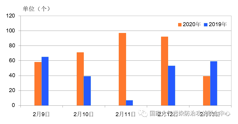 圖3 2020年2月9日-2月13日重污染天氣期間“2+26”城市工業(yè)熱高值區(qū)與去年同期數(shù)量對比