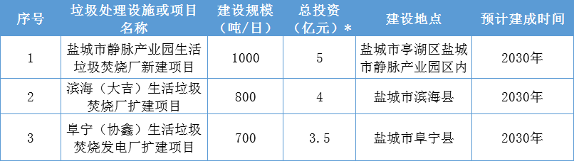 鹽城市發(fā)布的垃圾焚燒規(guī)劃共4個(gè)項(xiàng)目,其中日處理規(guī)模1400噸的鹽城市靜脈產(chǎn)業(yè)園生活垃圾焚燒廠已按相關(guān)規(guī)定進(jìn)行公示聽證,目前已投產(chǎn)試運(yùn)行。其余還有3個(gè)垃圾焚燒項(xiàng)目,將于2030年前完成,總投資12.5億元,總處理規(guī)模2500噸/日。詳情如下: